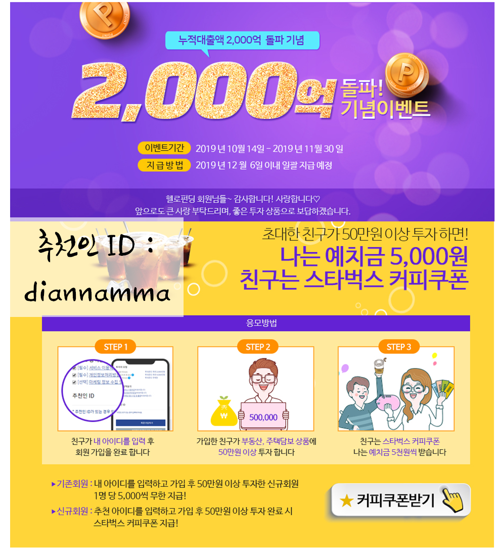 가입 시 추천인 입력 후 50만원 이상을 투자하면 스타벅스 커피 쿠폰을 지급하고 있습니다.