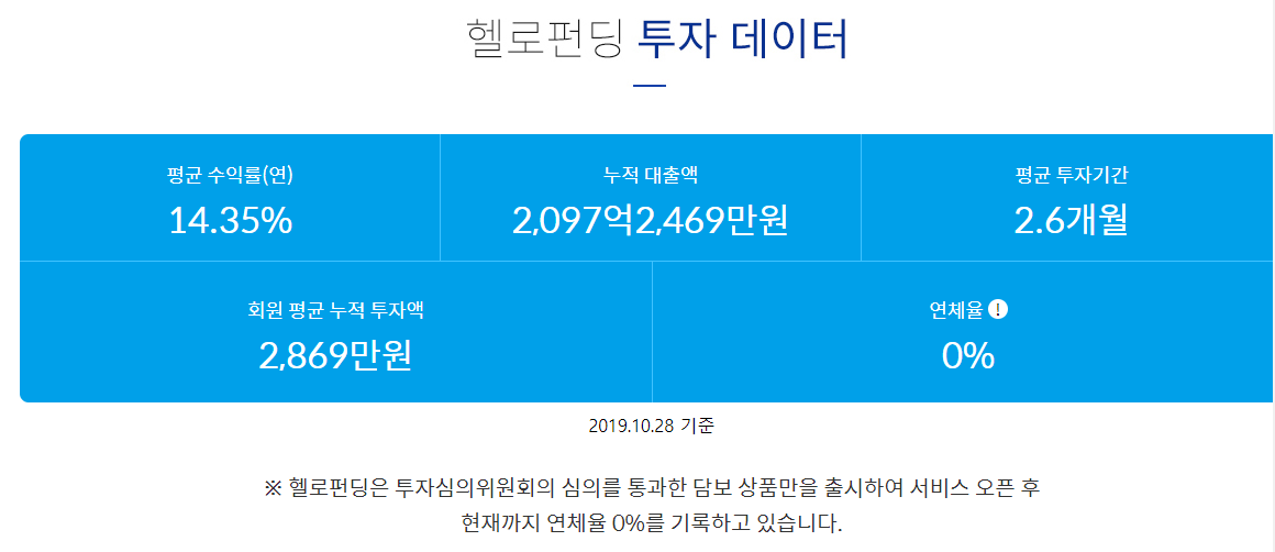 지금까지 헬로펀딩은 0%의 연체율을 14.35%의 수익률로 지금까지 유지하고 있습니다.